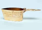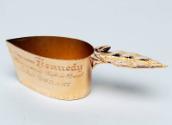 Physical DescriptionTear drop shaped coffee scoop with decorative coffee leaf handle. The handle is flanked by two coffee beans where it is attached to the scoop. The exterior of the coffee measure is engraved along the bottom edge "A medida ideal para um bom café" (an ideal measure for a good cup of coffee). It is inscribed to President Kennedy along the upper edge with "Joao Goulart" engraved across center.
