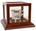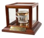 Physical DescriptionWhite ceramic mug with handle trimmed in gold leaf. "John F. Kennedy" is inscribed across front in gold lettering. Mug is encased in a glass and wood presentation case. Brass plaque across front of case is engraved: 'Shaving mug used by Senator John Fitzgerald Kennedy in Senators' private Barbershop January 3, 1953 to December 22, 1960.'
