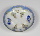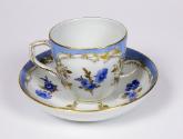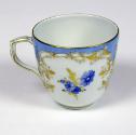 Physical Description12 china cups and saucers with gold and blue floral design on white glaze. The cup and saucer have a gold rim and detailing in the design.