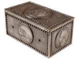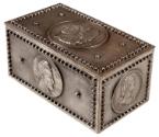 Physical DescriptionRectangular shaped chest with relief depictions of medals originally minted by the Paris Mint on the 4 sides and lid. The medallions of George Washington in profile and Riders overlooking Boston are from a medallion commissioned by the American Congress in 1787 commemorating the liberation of Boston from the British occupation. The Latin legend is inscribed "Hostibus Primo Fugatis" or "for the first time the enemies are put to flight." The Latin exurgue is inscribed "Bostonium Recuperatum XVII Martii, MCCCLXXVI" or "Boston is recovered March 17, 1776 (Evacuation Day)." The medallion on the left side of the box, of Marquis de Lafayette in profile, is a replica of a coin produced by the Paris Mint commemorating the bicentennial of his birth. The medal on the front side of the chest is of Abraham Lincoln. The medallion on the lid of the box is the female personification of France, Republique Francaise. The inside of the lid has an inscription in relief print, "Les Groupesperlementaires, D'Amitie, France Etats Unis."