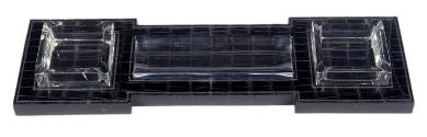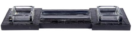 Physical DescriptionBlack alligator leather pen holder with a glass trough for holding pens set into center flanked by two glass square ashtrays. The pen holder is part of a 6 piece desk set.