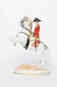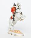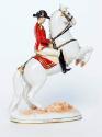 Physical DescriptionPorcelain figurine of a rider of the Spanish Riding Academy in Vienna dressed in a red tunic mounted on a white horse. Horse is portrayed in a rearing position.